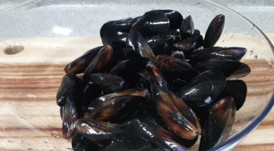 그리고 홍합 탈골을 해요. 홍합의 입구에 있는 검은 부분을 잡고 바깥쪽으로 당겨주면 쉽게 떼어낼 수 있어요. 홍합을 깨끗하게 씻어 분량에 맞게 준비해둔 물에 넣어주세요.