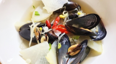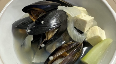 약 15분 정도 더 끓인 후 나머지 재료를 모두 넣고 조금 더 끓이면 완료돼요. 기호에 따라 고추냉이(와사비)를 풀어 먹어도 좋다고해요. 그런 다음 체에 밭쳐 물기를 빼주면 재료 준비 완료입니다. 팔팔 끓는 육수에 깨끗이 씻은 홍합을 넣고 입을 벌릴 때까지 푹 끓여주기만 하면 되어요. 마지막으로 간을 보고 싱거우면 소금 살짝 추가하면 맛있는 홍합탕 완성입니다.