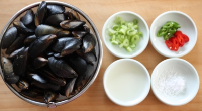 홍합 1kg, 대파 2대, 청양고추 3개, 홍고추 한 개, 물 5컵, 청주 반 컵, 소금 약간만 있으면 되어요. 부재료로는 다진 마늘 한 큰술, 후춧가루 약간, 간장 4큰술, 식초 6큰술, 설탕 2 큰술, 고춧가루 적당량이 필요합니다.