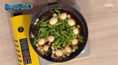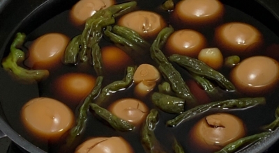 양념장의 설탕이 다 녹은 후 삶은 계란 또는 메추리알을 넣어줍니다. 만약 터진 계란이나 메추리알이 있다면 그것은 빼는 게 좋아요. 노른자가 간장 양념을 다 흡수하니 빼고 하는 것이 좋아요. 계란을 넣고 끓이는 시간 관계없이 원하는 색깔이 나올 때까지 끓여주면 됩니다. 계란을 끓이는 동안 부재료를 손질해요. 꽈리고추는 양념이 잘 배도록 이쑤시개로 꽈리고추에 구멍을 뚫어주어요.