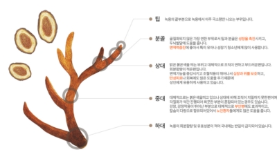 대체로 녹용의 꼭대기는 버섯 모양이거나 길게 약간 뾰족하며 몸체는 원통형입니다. 녹용은 그 부위에 따라 보통 4부분으로 구분하는데 녹용의 가장 꼭대기 부분은 황색의 꿀이나 기름기 있는 흰색 지방처럼 생겨 납편이라 하고, 그 바로 밑의 상중대에 속하며 혈색중에 황색을 나타내거나 순전히 혈색을 띠는 것을 혈편이라 해요.