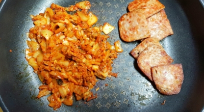 만에 하나라도 집에 만들어 둔 장조림이 있으면 더욱 금상첨화겠죠. 이제 팬에 잘게 썬 묵은지를 넣고 볶습니다. 오늘 소개할 레시피의 또 한 개 특이한 점은 묵은지를 넣고 볶을 때 기름을 넣지 않는다는 것이예요.