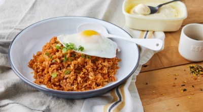 혼합물을 밥 위에 붓고 1분 더 볶아줍니다. 계란을 넣는 경우 밥을 팬의 한쪽으로 밀고 빈 공간에 계란을 깨뜨려줘요. 달걀이 익을 때까지 스크램블한 뒤에 밥에 섞습니다. 김치볶음밥에 고추장이나 쌈장으로 간을 살짝 맞추어주면 좋답니다.