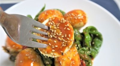 계란을 넣고 끓이는 시간 관계없이 원하는 색깔이 나올 때까지 끓여주면 됩니다. 계란을 끓이는 동안 부재료를 손질합니다. 꽈리고추는 양념이 잘 배도록 이쑤시개로 꽈리고추에 구멍을 뚫어줘요. 꽈리고추와 청양고추를 같이 쓰면 더욱더 맛있답니다. 매콤한 맛이 계란의 텁텁함을 잡아준답니다.
