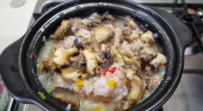 재료 전복 큰 사이즈로 5마리, 쌀 1컵 반, 찹쌀 반컵, 참기름 2숟가락, 다진 마늘 1숟가락, 쌀뜨물 1L 국간장 1숟가락, 꽃소금 반 숟가락.