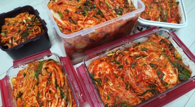 물기가 빠진 배추를 양푼에다 놓고 배추 속 양념을 골고루 발라주며 배춧잎 켜켜이 양념 속을 보태어줍니다. 배추를 반으로 접어 겉 배춧잎으로 동그랗게 띠를 둘러 감싸 준 뒤 김치 통에 차곡차곡 담습니다. 4시간 정도 걸려서 김치를 다 치대 넣었어요. 이렇게 김장김치를 완성하였어요.