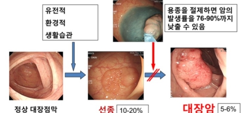 대장암은, 조직학적으로는 점막에서 시작되는 선암이 대부분입니다. 드물게는 신경 내분비세포종양과 림프종등에 의해서 암이 발생을 하기도 그렇지만, 단, 보통 대장암이라고 하면 선암을 말하고 있어요. 선암으로 발전하기 이전에 대부분 용종(polyp)의 형태를 갖고 있어서 대장내시경으로 이 용종의 유무를 발견하는게 상당히 중요시되는 부분입니다. 하지만 모든 용종이 암으로 발전되는것은 아니고, 조직학적인 특징에 따라 악성종양의 잠재적인 효과를 구분합니다.